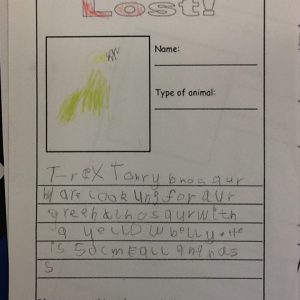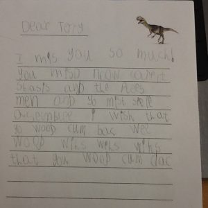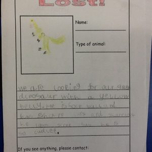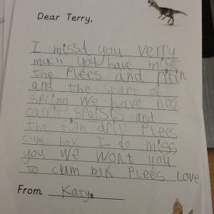 Puffin class were shocked to discover that Terry T-Rex (our class pet) had vanished! Speculation was rife as to where he had disappeared to. Had he been taken? Did he escape? Is he on an adventure? The children made ‘Lost’ posters to try and spread the word. We had a visit from PC Dave and PC Darryl, who sent a picture of Terry to dispatch. Eventually the mystery was solved… he had gone off to see his old friends in Year 1. The children wrote letters to Terry to try and encourage him to return to Puffin Class. Eventually, after much worrying and wondering, the children heard a loud knock on the door. It was Terry! He had wandered back on his own, exhausted from his journey, and fell asleep on Miss Peterson’s chair.